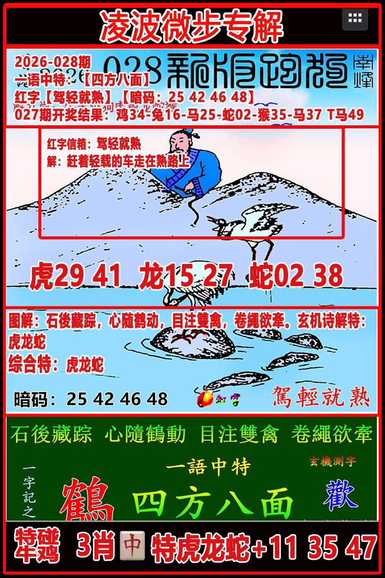 解析:石後藏踪,心随鶴動。目注雙禽,卷繩欲牽。解特:龙牛蛇虎猪鼠马