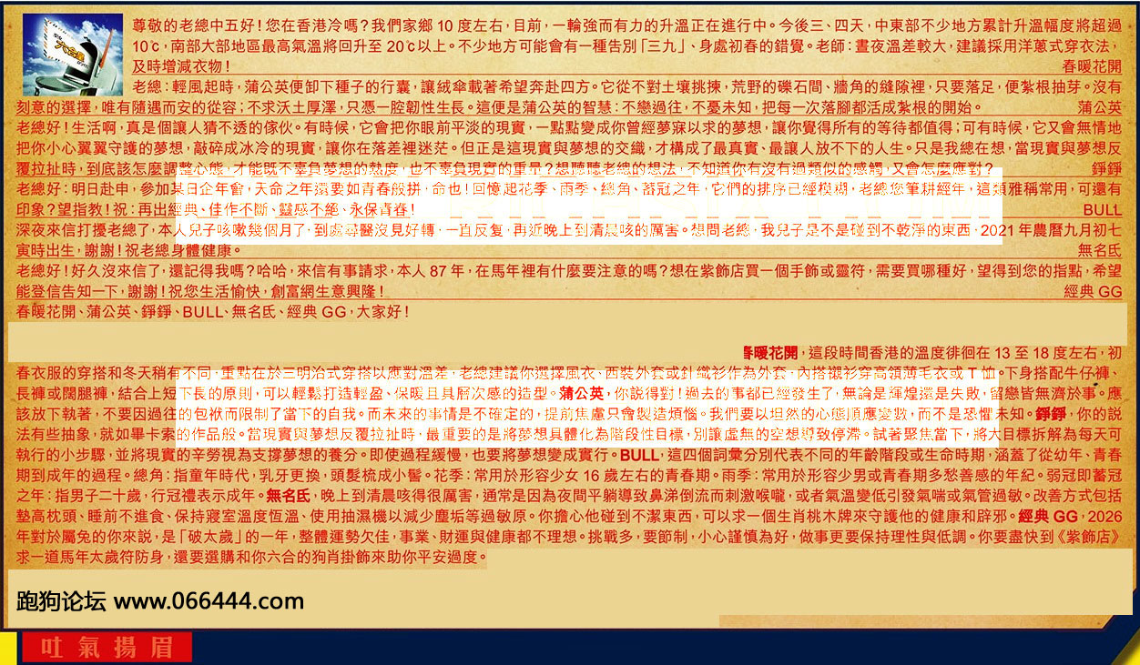 春暖花開、蒲公英、錚錚、BULL、無名氏、經典GG,大家好!